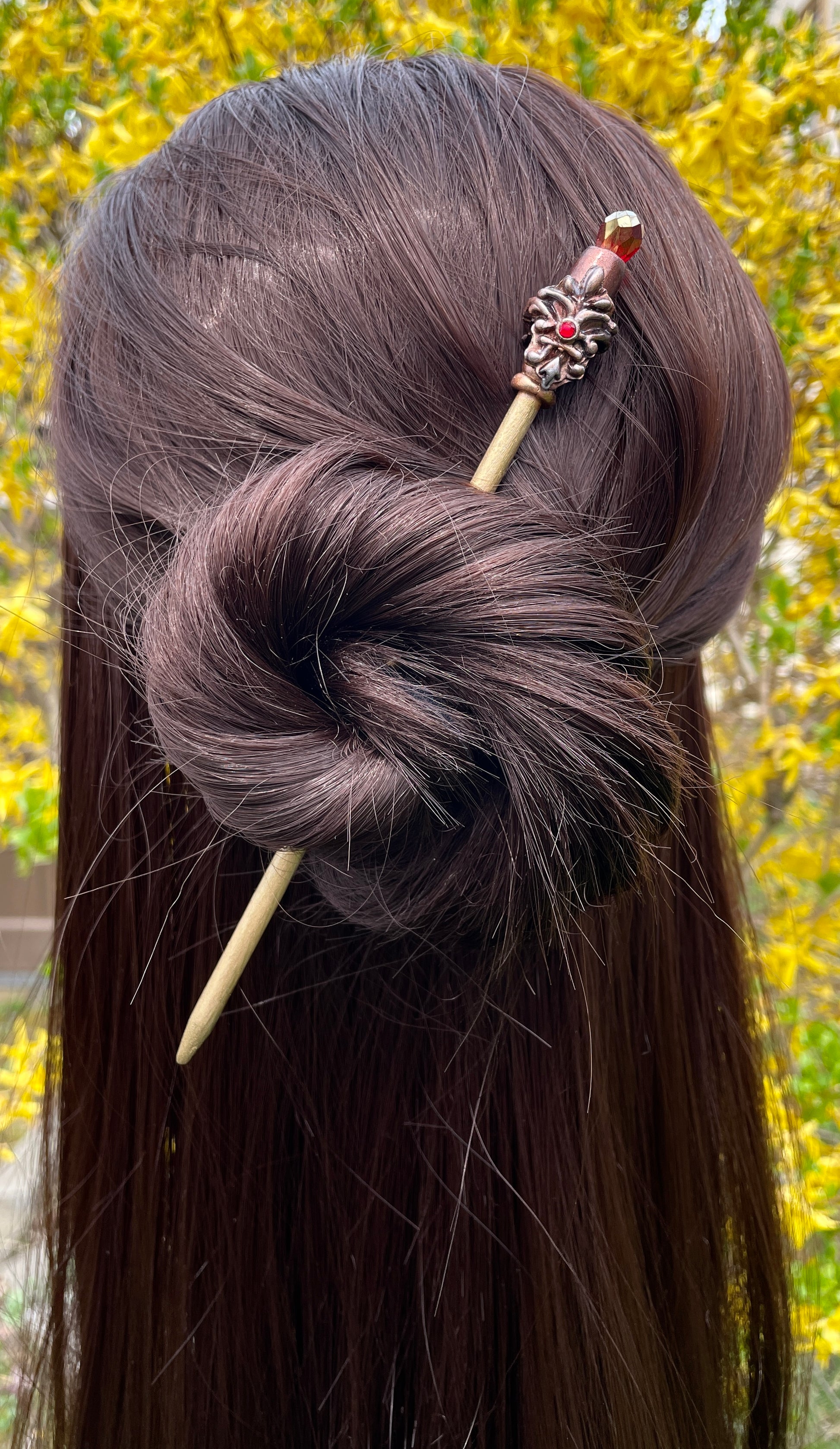 A bronze colored baroque style hair stick with ruby red crystals measuring 6.5 inches long.