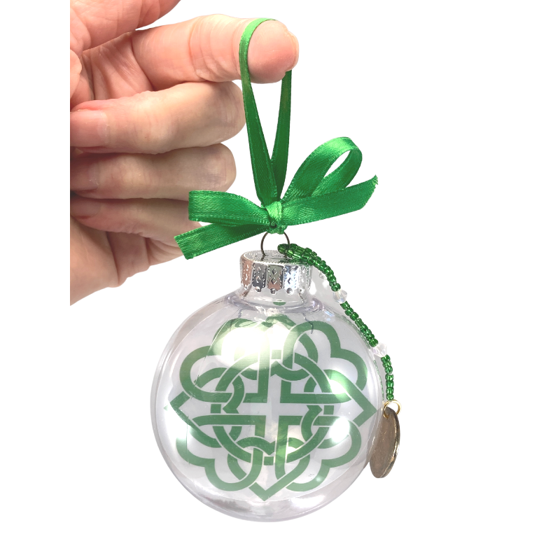 Celebrating an Irish Christmas? These 2.5" shatterproof Irish Christmas bauble has a delightful green love knot heart design on plastic giving the illusion its floating inside the ball. Soft satin emerald green ribbon bow and strand to hang perfectly on your Christmas tree. To add a little sparkle, a handmade shamrock charm dangles from a beaded emerald green strand with clear crystals.
