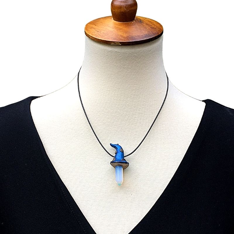 Wonderfully magical and whimsical, this little fantasy wizard Opalite crystal point necklace would delight any fantasy genre fan.