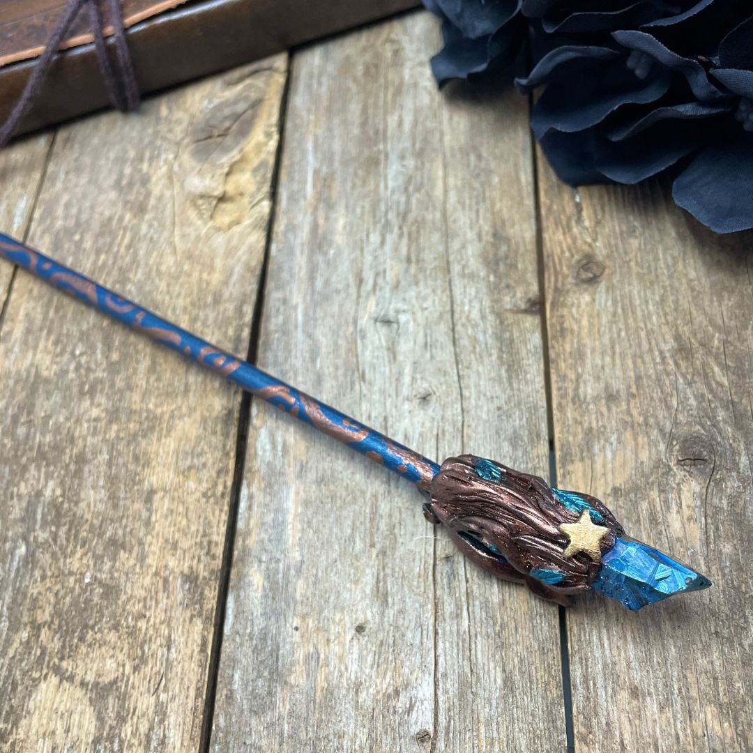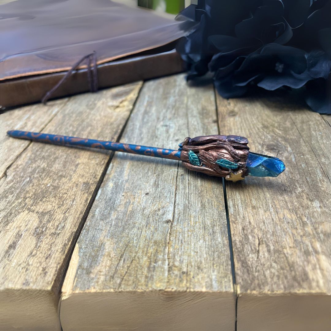 Meet the Forest Owl Hair Pin, a little piece of woodland magic. This handcrafted owl hair stick is sculpted with polymer clay over a wood dowl core. The little crystal blue eyed owl, sits quietly among the tree branches with a star shining above.