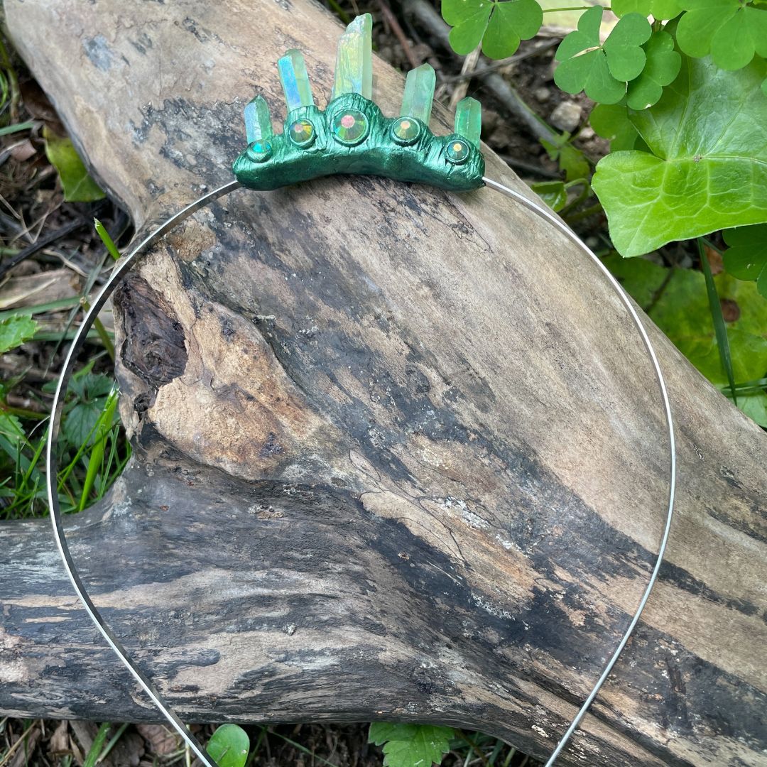 Enchanting Crystal Design: Five natural green raw point crystals with an iridescent AB shimmer, accented by sparkling round crystals for that ethereal glow.
