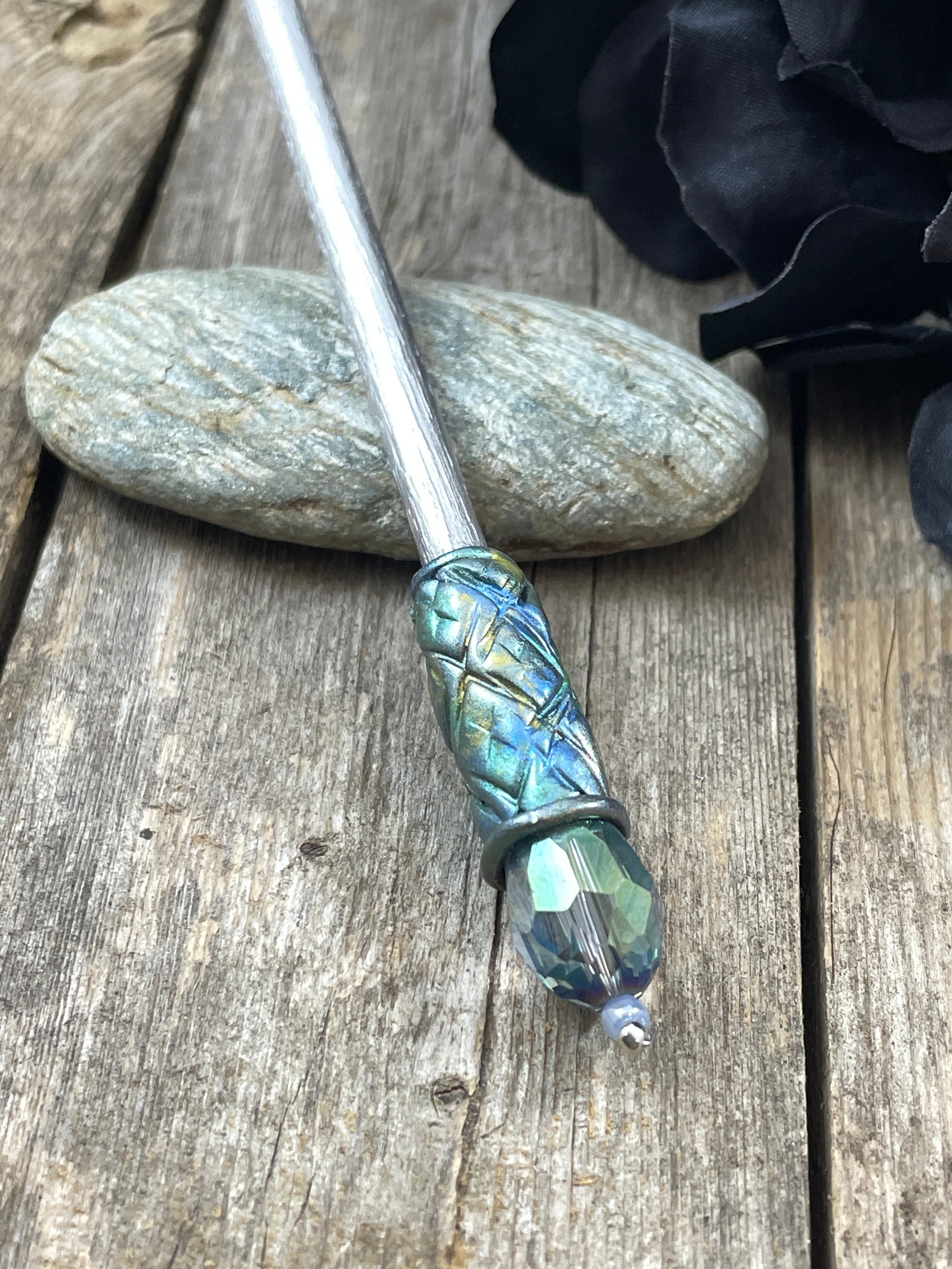 A hand painted diamond textured polymer clay hair art piece with a pale green crystal with aurora borealis finish.