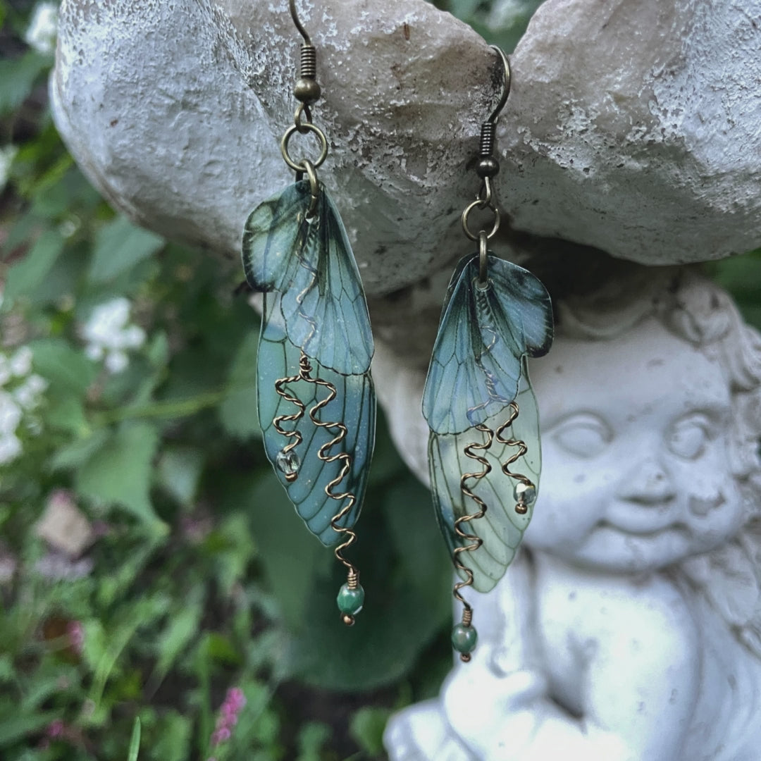 Woodland Fairy Grunge Earrings: Half blue, half copper wings with matte copper crystals that dangle from twisted copper branches.