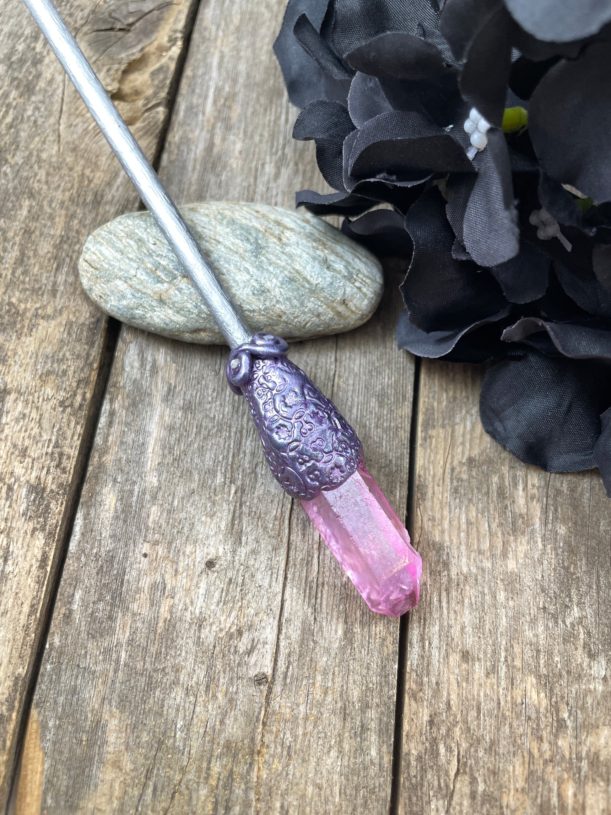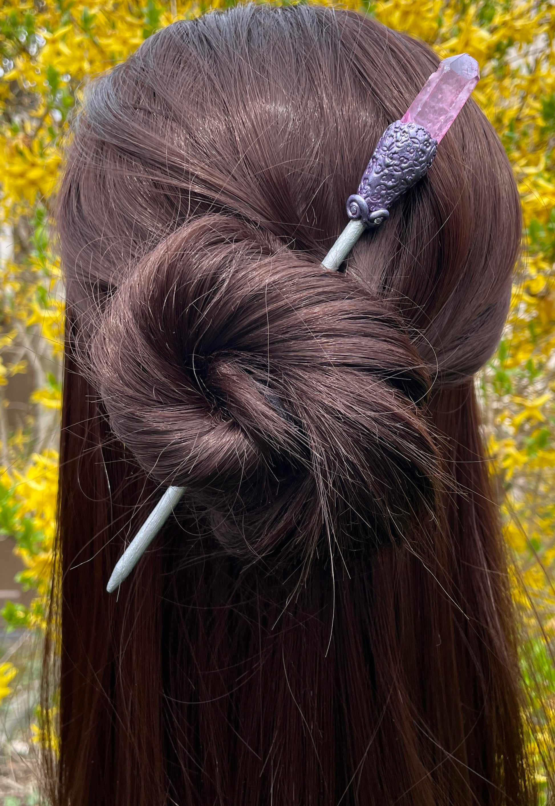 A pink raw crystal hair stick with polymer clay floral textured design measuring 6.5 inches long.