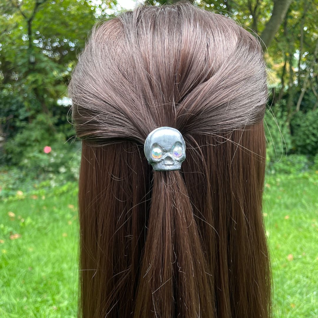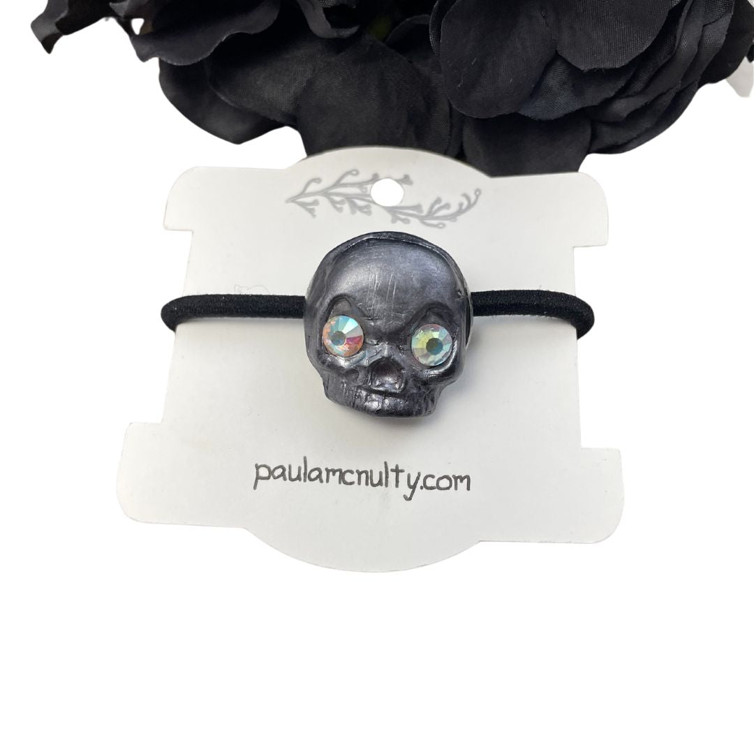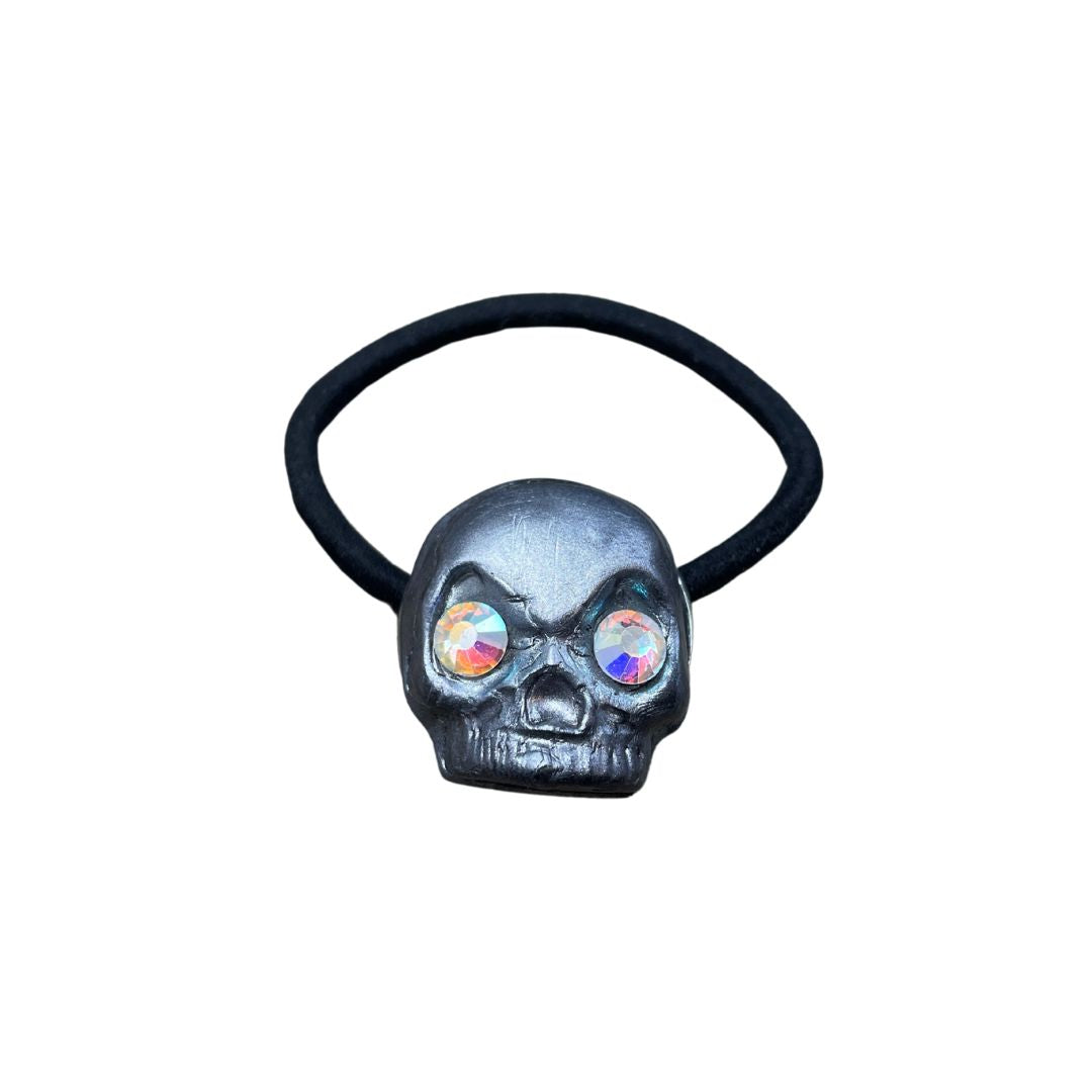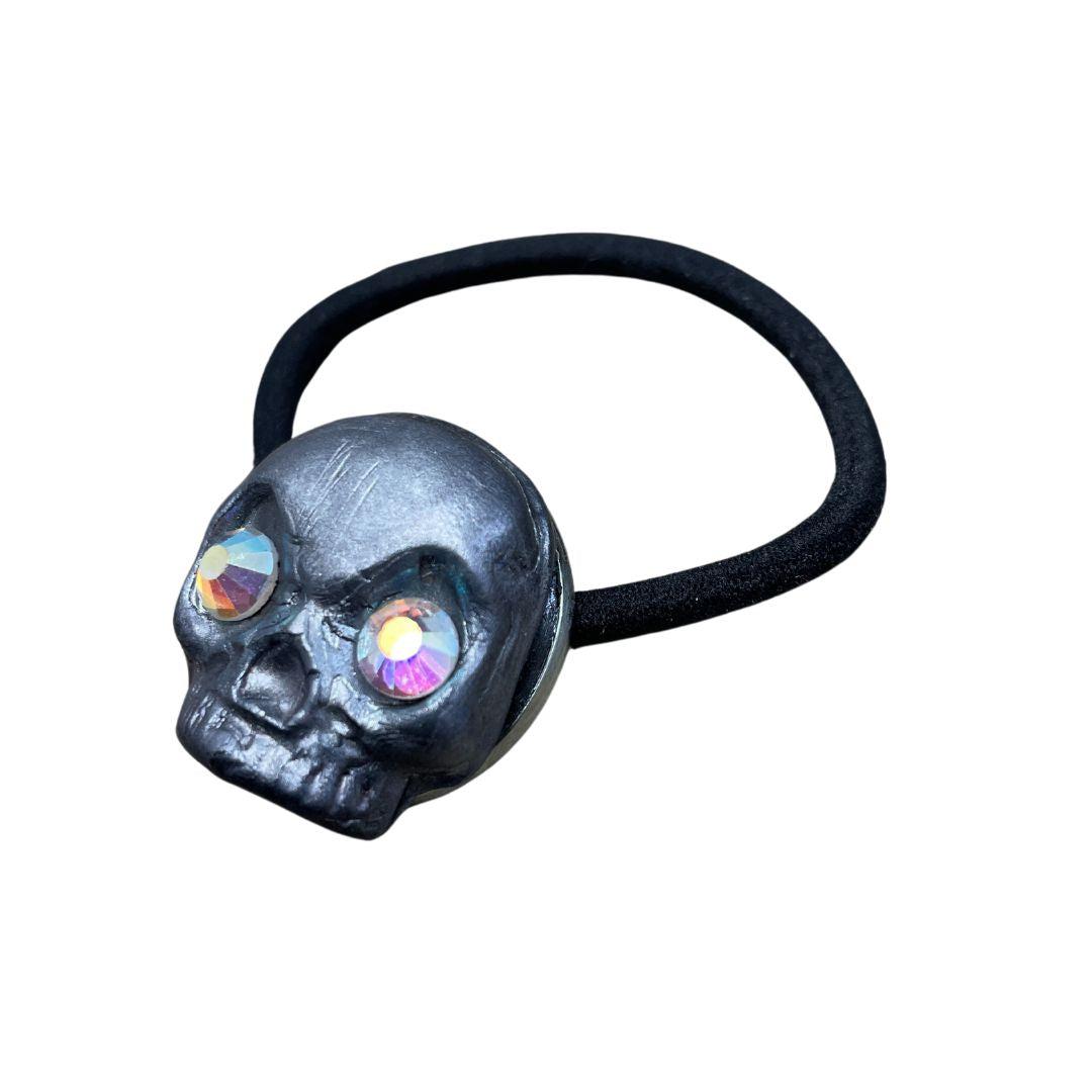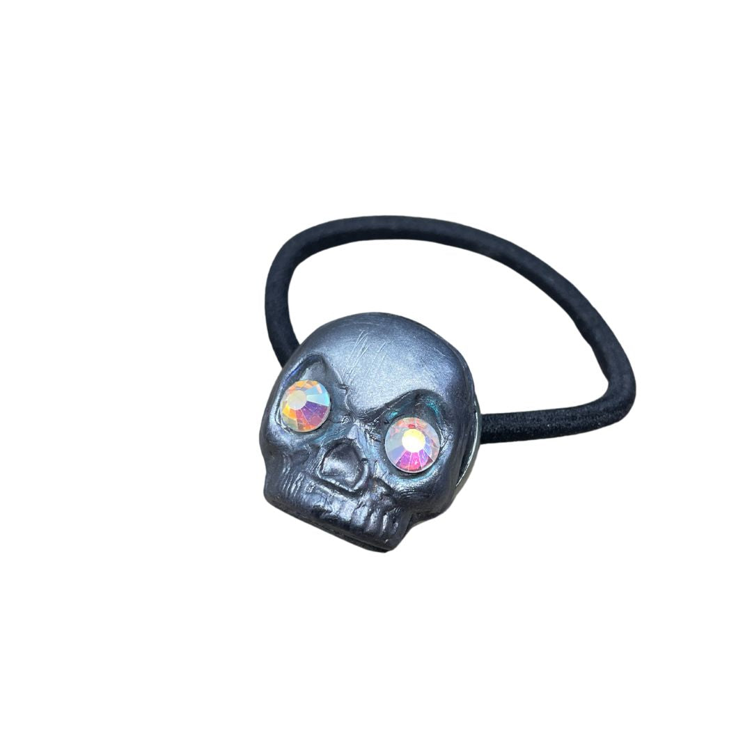 Created with polymer clay, this lightweight skull ponytail hair tie is beautifully hand painted dark silver with rainbow crystal eyes that catch the light and sparkle.