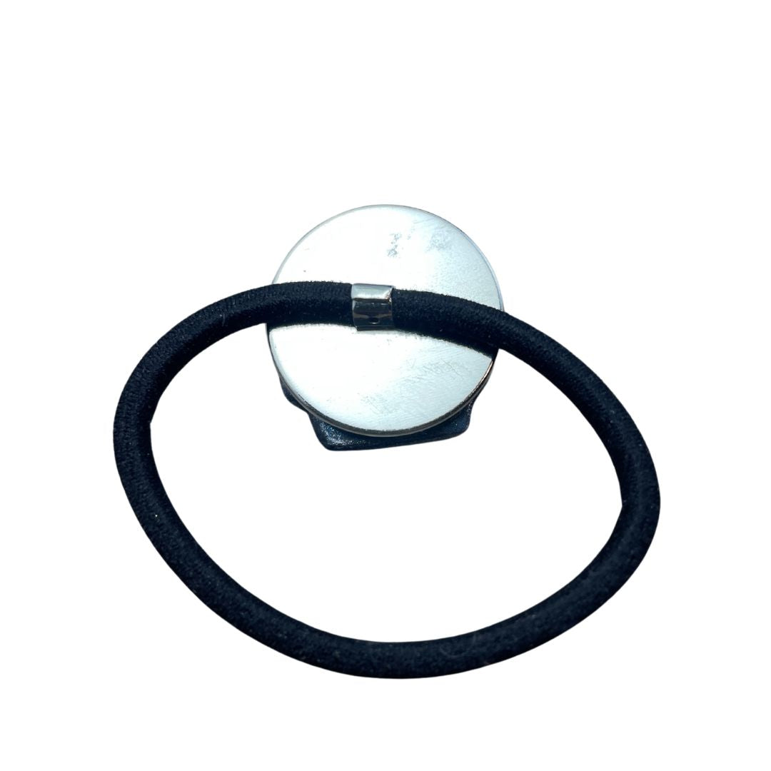 On the reverse, the 4mm thick (2 inch diameter) ponytail elastic band is nice and stretchy and can be turned comfortably 2-3 times to hold your hair in place. You can also wear it as a hair tie bracelet.