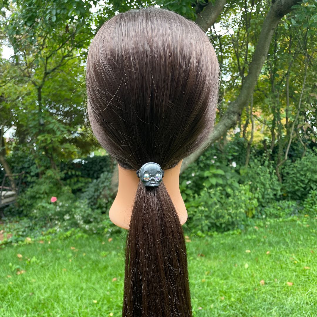 The nice thing about this skull hair tie is that the elastic band can be removed once old, worn and stretchy, and can easily be replaced with a new one so you can keep wearing this fun skull hair art.