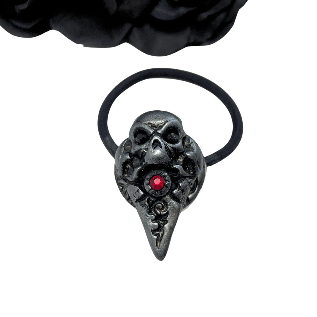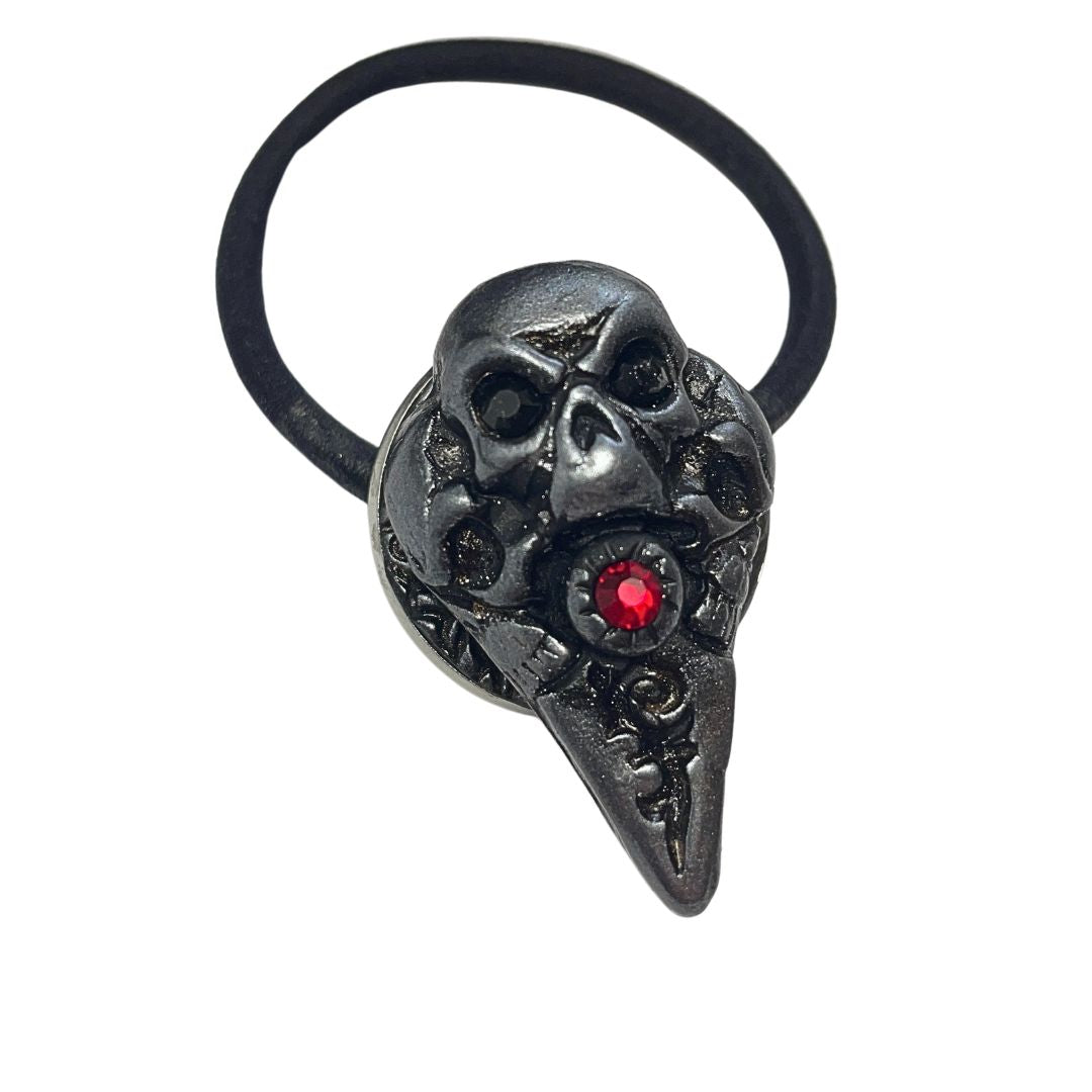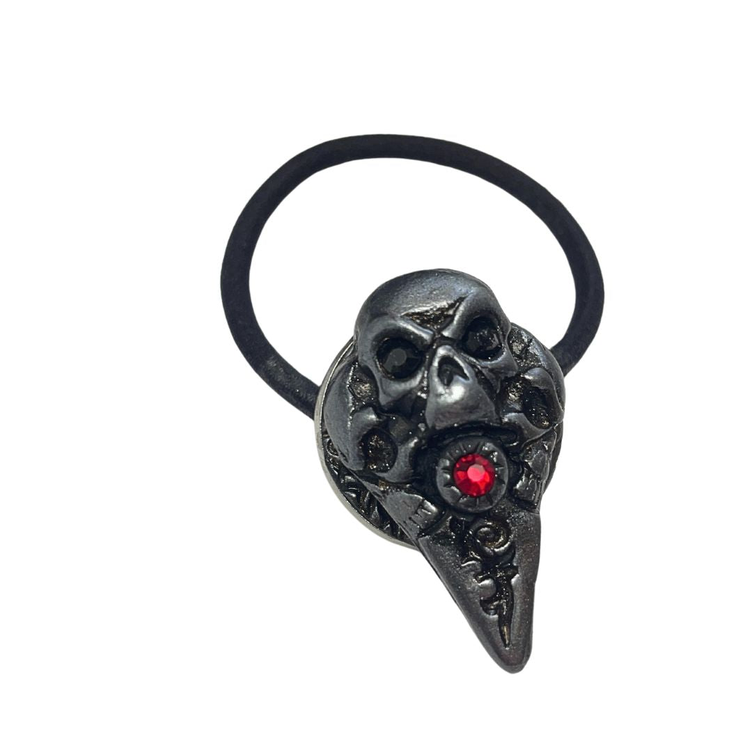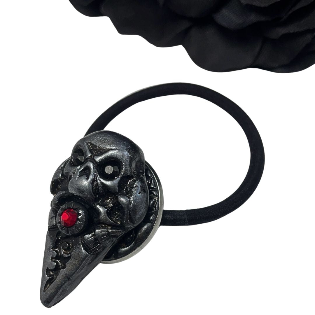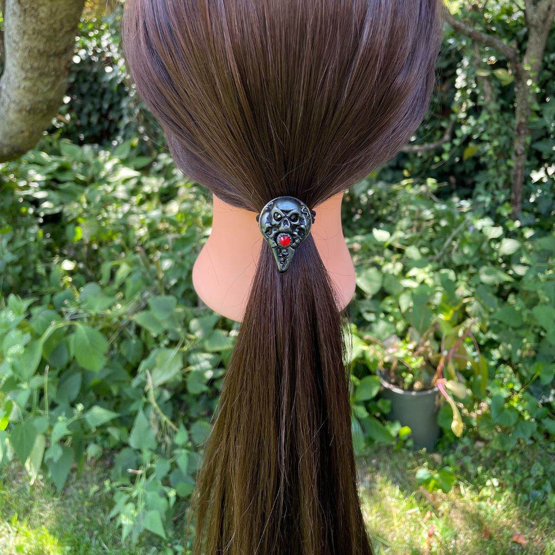 Created by hand with polymer clay, this lightweight ponytail hair tie features 3 striking skulls highlighted with silver pigment, along with textured filigree clay details. A red sparkling crystal sits below the front skull that gives this hair accessory a gothic creepy vibe.