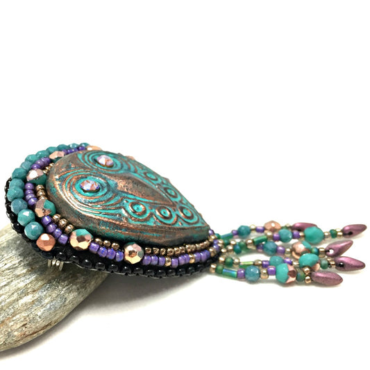 A collection of stunning handcrafted shawl pins with crystals, silk, polymer clay...